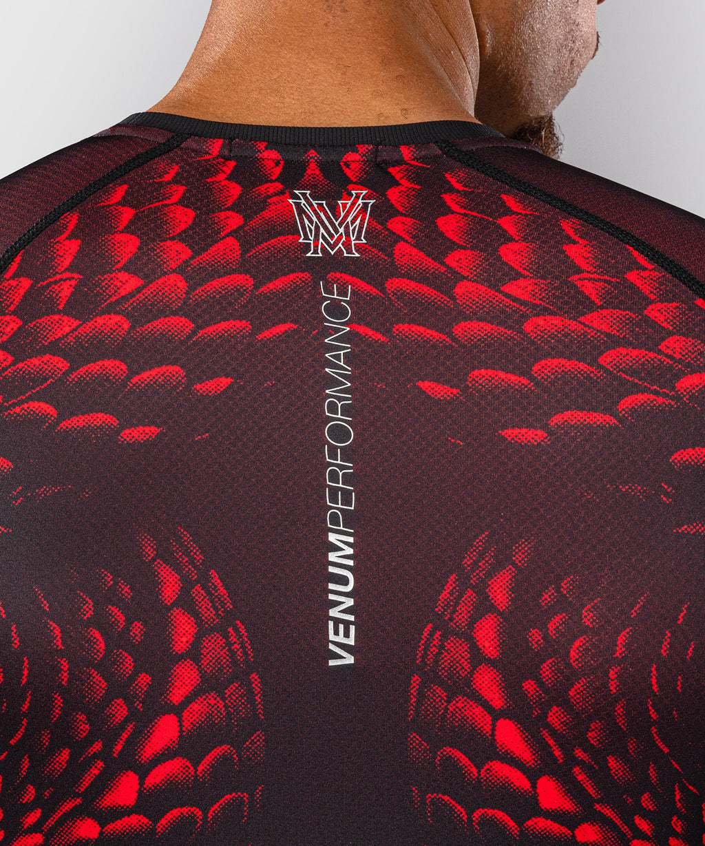 Rashguard manches longues Venum Matupa Noir Rouge Argent : un haut Venum orienté grappling, conçu pour limiter les irritations et améliorer le confort sur les phases au sol.